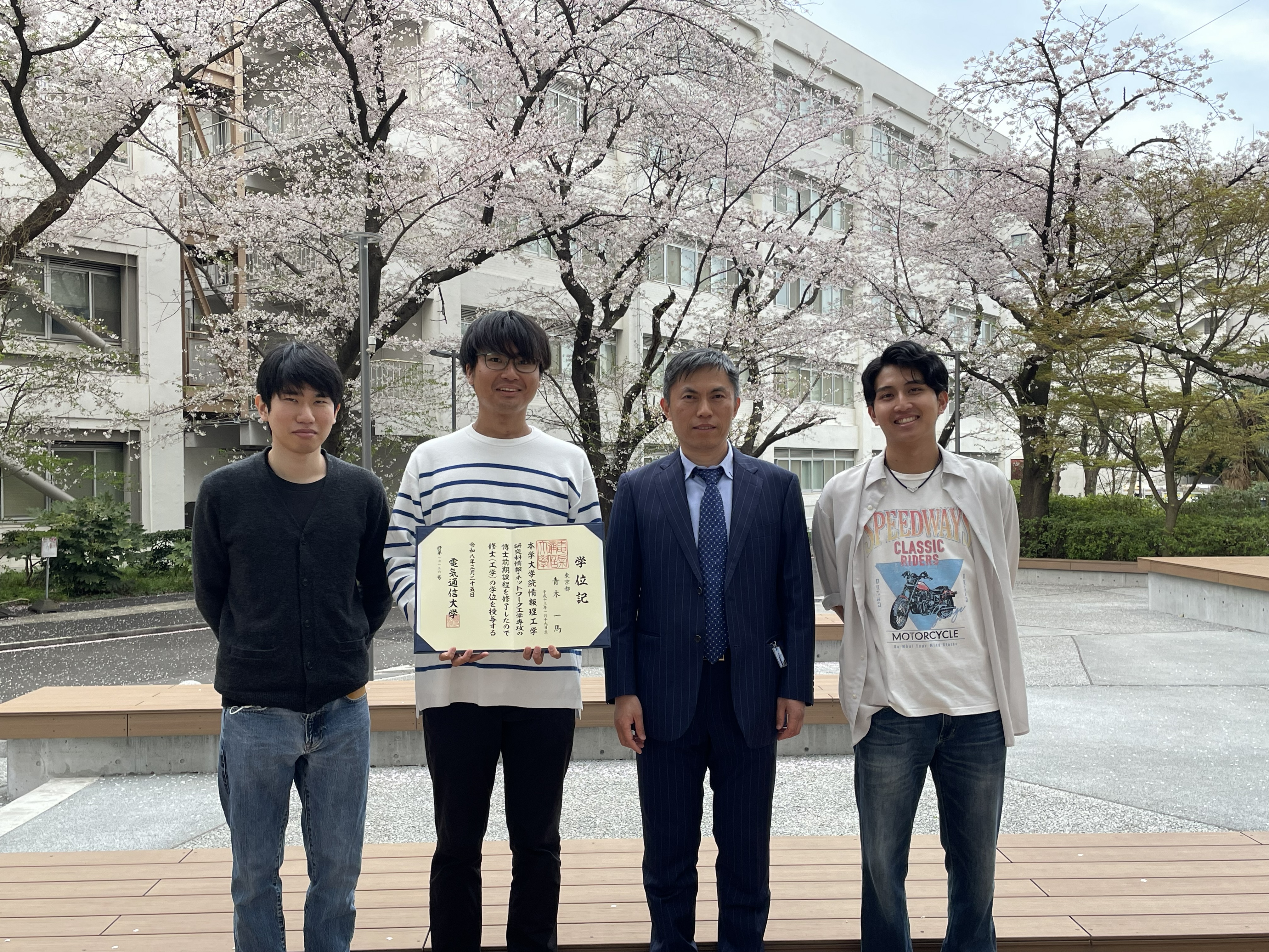- 博士前期課程の瀬川 洋介くん、学部4年生の徳永 大貴くん、中川 輝紀くん、山見 悠人は、卒業しました。 瀬川 洋介くんは最優秀卒業生として目黒会賞を受賞しました。集合写真1, 集合写真2, 集合写真3 (2022.3.25)